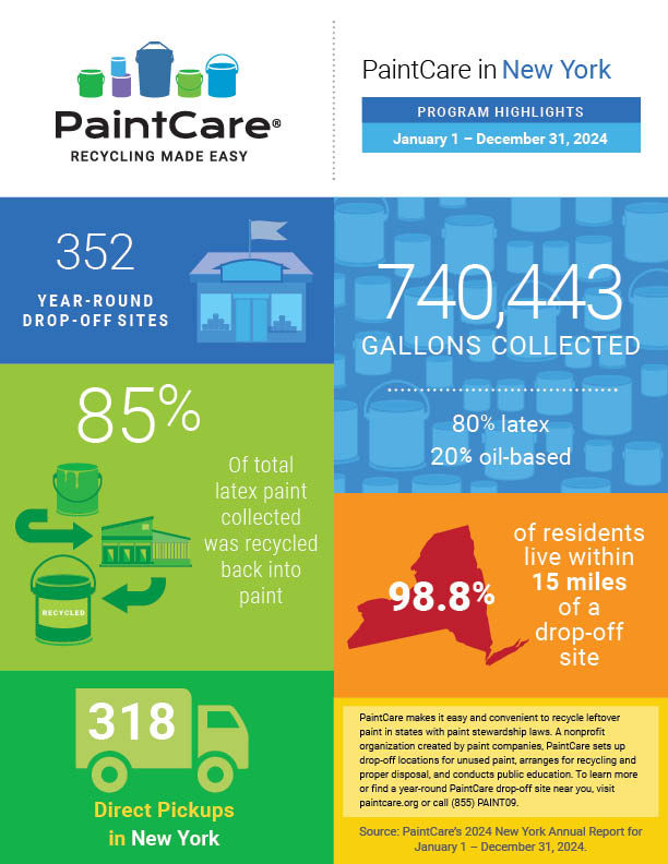 This one-page infographic highlights the successes from the most recent reporting period for the New York PaintCare program (January to December 2024). Please consider downloading and printing a copy of the infographic and then posting it for staff and the public at your business or organization.
