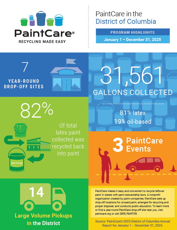 This one-page infographic highlights the successes from the most recent reporting period (January to December 2025) for the District of Columbia PaintCare program. Please consider downloading and printing a copy of the infographic and then posting it for staff and the public at your business or organization.