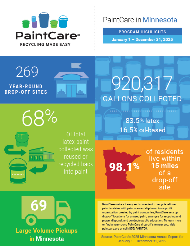 This one-page infographic highlights the successes from the most recent reporting period (January to December 2025) for the Minnesota PaintCare program. Please consider downloading and printing a copy of the infographic and then posting it for staff and the public at your business or organization.